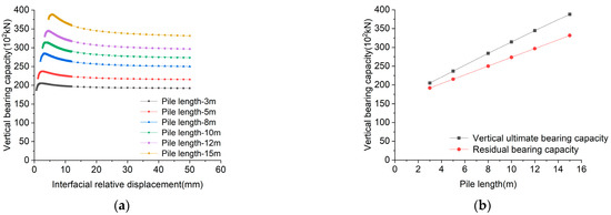 Different pile length conditions: (a) relationship between displacement and vertical bearing capacity of the pile; (b) Relationship between pile length and vertical ultimate bearing capacity and residual bearing capacity.