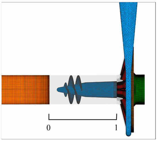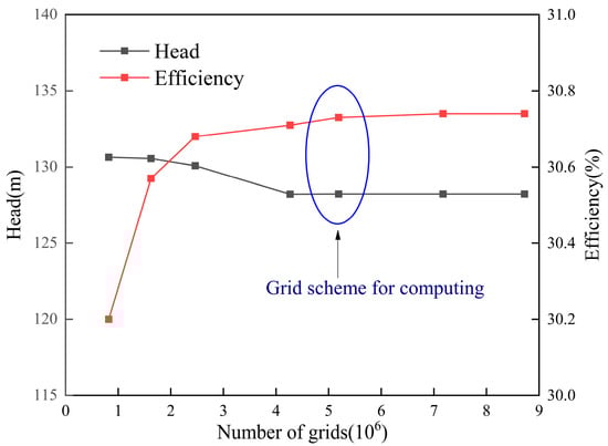 Considering the complexity and irregularity of the pump structure, the entire computational fluid domain is meshed by a well-adapted nonstructural tetrahedral grid, including the inducer and the volute, and structural meshing for inlet, impeller, front pump chamber and back pump chamber. The grid of the main fluid domains is shown in Figure 3. Six different sets of full flow field grid numbers are used to check the grid-independence. The results are shown in Figure 4. When the number of grids reaches 5.19 million, the variation error of the calculated head of the centrifugal pump is less than 1% as the number of grids increases. Finally, the computational accuracy and computational efficiency are considered comprehensively, and a full flow field computational grid with the number of 5,198,692 is used in this paper.