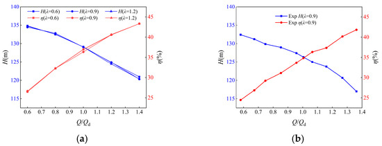 In order to improve the overall performance of the model pump, an increased flow coefficient design method was used in the design, so the maximum efficiency value is not at the design operating point. The performance curve of the centrifugal pump with the inducer obtained from the numerical simulation is shown in Figure 5a. The heads of scheme λ1, λ2, and λ3 are 129.092 m, 129.049 m, and 129.065 m, and the efficiencies are 36.96%, 36.35%, and 36.99%, respectively, at a flow rate of 1.0Qd. The Experimental performance curve is shown in Figure 5b. The numerical simulation results are in good agreement with the experimental results, with the head error less than 3% and the efficiency error less than 7%. The results show that the inducer at different axial positions between λ = 0.6 and λ = 1.2 does not have a large impact on the head and efficiency of the centrifugal pump, which is because the most important working component in the pump is the impeller.