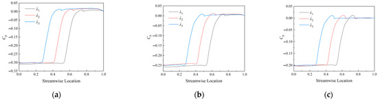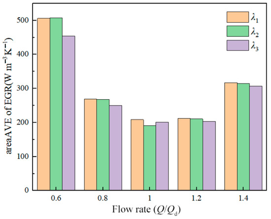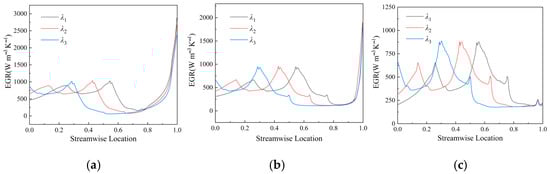 Figure 10a–c show the surface-average entropy generation rate in the axial direction of the inducer at 0.6Qd, 1.0Qd and 1.2Qd, respectively. The entropy generation rate increases gradually at the inlet of the inducer, because the backflow vortex is generated at the leading edge. The entropy generation rate increases first and then decreases at the rim, while in the trailing edge of the inducer, it slightly increases and then decreases. When the fluid flows near the inducer outlet, the entropy generation rate increases again. At the 0.6Qd flow rate, as shown in Figure 10a, the entropy generation rate gradually decreases with the increase of λ at the outlet of the inducer. At the 1.0Qd flow rate, as shown in Figure 10b, the trend at the outlet is the same as at 0.6Qd, but the difference in entropy generation rate becomes smaller for different axial distances. At the 1.2Qd flow rate, as shown in Figure 10c, the entropic generation rate is very low, which is different from the entropy generation rate in the outlet at 0.6Qd and 1.0Qd, and there is no change in the three axial distances. With the increase of flow rate, the entropy generation rate at the inducer rim decreases slightly and remains near 1000 W·m−3·K−1. The entropy generation rate at the trailing edge of the inducer increases with the increase of flow rate, resulting in more energy loss. The energy loss at the outlet of the inducer decreases with the increase of the flow rate. When the flow rate reaches 1.2Qd, the rate of entropy generation rate decreases sharply.