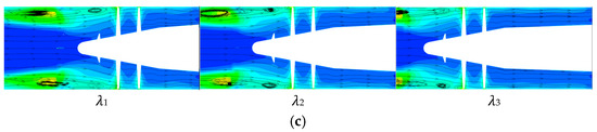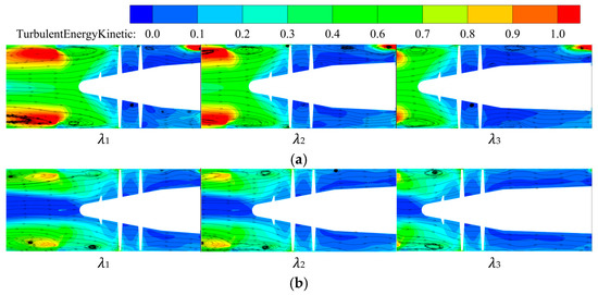 Turbulent kinetic energy indicates the degree of the turbulent vortex; the higher the value of turbulent energy, representing the more violent the fluid velocity pulsation, the greater energy loss of the fluid flow. Figure 8a–c show the turbulent kinetic energy distribution and flow line of the radial surface of the inducer. It can be seen from the figures that the turbulent kinetic energy is higher in the region of the leading edge of the inducer. The reason for the large turbulence kinetic energy is that the main stream is at the entrance and the blade is at a certain angle of attack. However, as the flow rate increases, the turbulent kinetic energy gradually decreases. The greater the flow velocity, the greater the dynamic pressure, the lower the static pressure, and thus the strength of the backflow will decrease. The back flow vortex area of the inducer decreases with the increase of the flow rate, and the back flow area of the tip clearance of the inducer is the largest at 1.0Qd. At the same flow rate, with the increase of λ, the streamline state from the trailing edge of the inducer to the outlet is better, and the vortex in the flow channel develops more fully. Increasing the axial distance of the inducer can result in a reduction of turbulent kinetic energy from the trailing edge to the outlet of the inducer, which can ultimately decrease flow resistance and energy loss in the fluid.