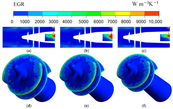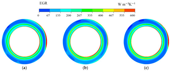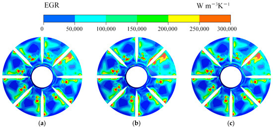 Entropy generation rate distribution of the interface of inducer and impeller at a flow rate of 1.0Qd: (a) λ1 = 0.6; (b) λ2 = 0.9; (c) λ3 = 1.2.