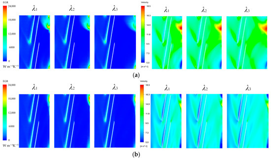 Entropy generation rate and velocity distribution in span = 0.95 of the inducer: (a) 0.6Qd; (b) 1.0Qd.