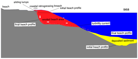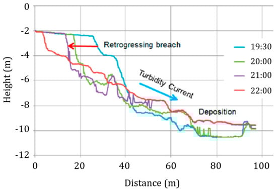 Coastal breach failure can occur in the nearshore zone when slope stability is locally broken (e.g., due to dredging or incision by currents). It is essential to note when evaluating safety that breaching may cause a “destabilizing” effect if the height of the breach face increases, leading to an uncontrolled retrogressive failure of the slope. A typical figure of the breaching mechanism is shown in Figure 3. The gravity flow of sand exiting from the retrogressing front starts and fuels sediment transfer, and the transported sand accumulates in the zone of a moderate slope as shown in Figure 3.