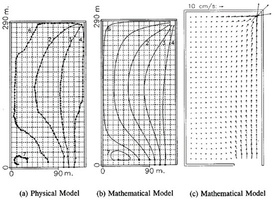 One of the verifications of the hydrodynamic sub-model HYDROTAM-3D was through a physical (hydraulic) model study performed in the Coastal Engineering Laboratory of the Middle East Technical University in Turkey. The velocities in the physical model were measured at the grid points neighboring the intake and then used as the boundary conditions in the mathematical HYDROTAM-3D model. The length scale of the hydraulic model was 1:50, where the length and width of the rectangular model marina basin were 5.80 and 2.8 m, respectively, and the average water depth was 0.2 m. Using the length scale of 1:50, these dimensions correspond to a prototype marina of 290 m × 140 m, with a water depth of 10 m. Surface water was withdrawn from the marina by installing a morning-glory spillway structure as forced flushing, which consists of a vertically placed conical shaft connected to a horizontal discharge pipe placed on the seabed. Velocity measurements were taken using a ‘Minilab SD-12 microscale 3-axis ultrasonic current meter. The morning-glory-shaped intake structure was placed at various locations in the basin, and the grid system used had a square mesh size of 10 m × 10 m. In HYDROTAM-3D, the vertical eddy viscosity was calculated by the k–ε model, and horizontal eddy viscosities were predicted by the sub-grid scale turbulence model. The water depth was divided into ten layers of equal thickness, and the density of water was taken as 1025 kg/m3. At t = 0, the pump was started, so that the water began to flow in the intake, whereas the remaining part of the water body was assumed to be at rest, and the water surface was horizontal. Steady-state conditions were reached approximately 1.5 h after the start of pumping in the hydraulic model.