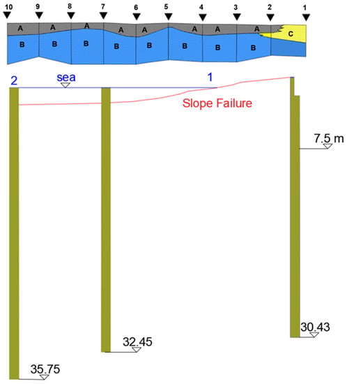 Coastal flow slides, also known as retrogressive breaching or liquefaction flow slides, are geomorphological processes that involve the downslope movement and redeposition of a significant amount of material from an underwater slope of a specific steepness [1,2,3]. However, their brief lifespan, unpredictable timing, and unseen initiation locations make them difficult to observe in nature and complicated to determine their causes and consequences [4]. Coastal flow slides are classified into two categories: breaching failure and liquefaction failure [5]. Breaching failure occurs when the slope of the beach is steep, while liquefaction failure occurs when the natural slope of the beach is mild [6]. In coastal engineering, the term “mild slope” refers to a topographic feature of the seafloor where the slope of the bottom terrain is relatively gentle or gradual over a large distance. In other words, the slope of the bottom terrain changes slowly and smoothly over a long distance compared to a steep slope. Mild slopes are commonly found in coastal environments such as estuaries, bays, and lagoons where there is a shallow water depth, and the seabed gradually transitions from the shore to deeper water. Coastal structures such as breakwaters, jetties, and seawalls are often designed to function effectively in the presence of mild slopes. Since the liquefaction flow slides occurs in mild slope regions, the area of concern needs to be examined thoroughly highlighted the need for increased awareness and research into this phenomenon to ensure the safety and effectiveness of coastal structures in mild slope regions. However, the danger of coastal liquefaction flow slides is significant, but it is not recognized as a prominent failure mechanism worldwide [7].