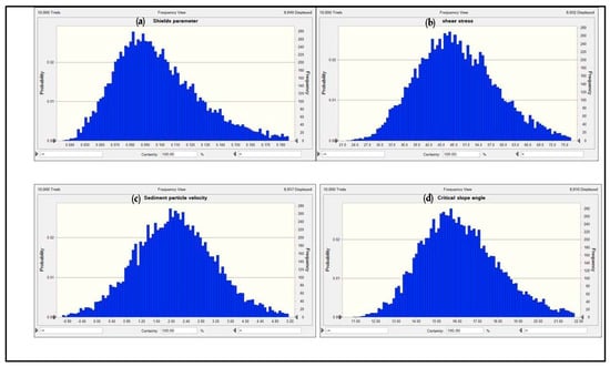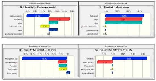 Shear stress, sediment particle velocity, and the critical slope angle were all found to correspond to a normal distribution, but the Shields parameter, owing to the asymmetry in the particle size distribution, followed a log-normal distribution. To further examine the effect of the random design factors on the population, scatter diagrams were created. The degree of relationship between design variables may be determined with the use of these diagrams, which depict the dependencies and interactions between forecast and design factors. Parameters of soil and fluids, such as permeability, porosity, particle density, friction angle, and water density, are shown to have relationships with active wall velocity as illustrated in Figure 19.