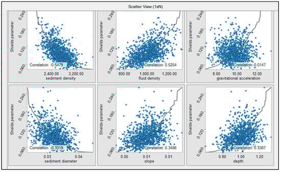 The Shields parameter, which plays a crucial role in sediment transport, has been found to exhibit complex relationships with several geomorphological and hydrodynamic factors as shown in Figure 20. In particular, the Shields parameter has a positive correlation with the density of the fluid, the gravitational acceleration, the slope, and the depth of the water as given in Figure 21. However, this relationship is found to be negatively correlated with the density of the sediment and the diameter of the sediment particles, suggesting that increased sediment density and diameter are associated with a reduction in the Shields parameter. The study has also revealed a positive correlation between fluid density and temperature.