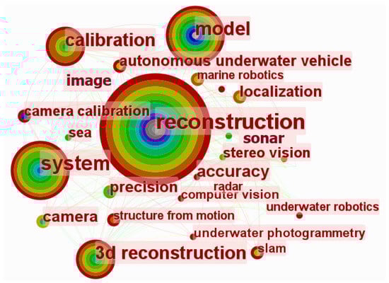 A keyword heat map was created using the retrieved documents, as shown in Figure 1. The larger the circle, the more times the keyword appears. The different layers of the circle represent different times from the inside to the outside. The connecting lines denote the connections between different keywords. Among them, ‘reconstruction’, with the largest circle, is the theme of this paper. The terms ‘camera calibration’, ‘structure from motion’, ‘stereo vision’, ‘underwater photogrammetry’ and ‘sonar’ in the larger circles are also the focus of this article and the focus of current underwater 3D reconstruction research. We can thus clearly see the current hotspots in this field and the key areas that need to be studied.