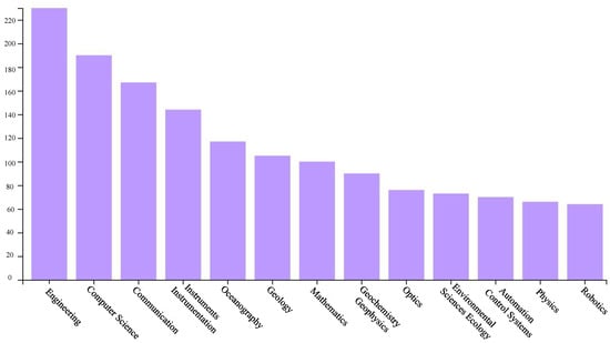 In addition, we also used the search result analysis function in Web of Science to analyze the research field statistics of papers published on the theme of underwater 3D reconstruction and the data cited by related articles. Figure 2 shows a line graph of the frequency of citations of related papers on the theme of underwater 3D reconstruction. The abscissa of the picture indicates the year and the ordinate indicates the number of citations of related papers. The graph shows that the number of citations of papers related to underwater 3D reconstruction rises rapidly as the years go on. Clearly, the area of underwater 3D reconstruction has received more and more attention, so this review is of great significance in combination with the current hotspots.
