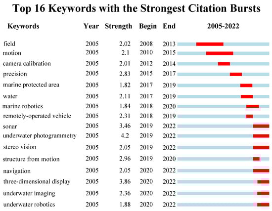 Figure 4 shows the top 16 keywords with high frequency from 2005 to 2022 made using the Citespace software. Strength stands for the strength of the keyword, and the greater the value, the more the keyword is cited. The line on the right is the timeline from 2005 to 2022. The ‘begin’ column indicates the time when the keyword first appeared. ‘Begin’ to ‘End’ indicates that the keyword is highly active during this year. The red line indicates the years with high activity. It can be seen from the figure that words such as ‘sonar’, ‘underwater photogrammetry’, ‘underwater imaging’ and ‘underwater robotics’ are currently hot research topics within underwater three-dimensional reconstruction. The keywords with high strength, such as ‘structure from motion’ and ‘camera calibration’, clearly show the hot research topics in this field, and are also the focus of this article.