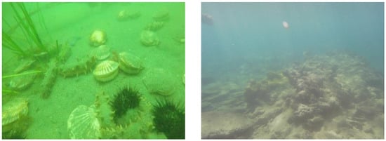 Every depth in the underwater environment affects RGB images, but especially the caustics in shallow water (water depth less than 10 m), that is, the complex physical phenomenon of light reflected or refracted by a curved surface, which appears to be the primary factor lowering the image quality of all passive optical sensors [39]. In abyssal-sea photogrammetry methods, noon is usually the optimum period for data collection because of the bright illumination; with regard to shallow waters, the subject needs strong artificial lighting, or the image to be captured in shady conditions or on the horizon to avoid reflections on the seabed [39]. If it cannot be avoided in the procurement stage, the image-matching algorithm will be affected by caustics and lighting effects, with the final result being that the generated texture is different from the orthophoto. Furthermore, caustic effects destroy most image-matching algorithms, resulting in inaccurate matching [39]. Figure 6 shows pictures of different forms of caustic effects in underwater images.