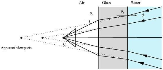 As mentioned in the particularity of the underwater environment, the refraction of the air–glass–water interface will cause a large distortion of the image, which should be considered when calibrating the camera [66]. The differential in densities between the two mediums is what causes this refraction. The incoming beam of light is modified as it travels through the two mediums, as seen in Figure 9, altering the optical path.