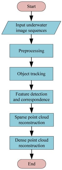 At present, 3D data measurement and object reconstruction technologies are being gradually applied to underwater scenes, which has become a hot research direction. They can be used for biological investigation, archaeology and other research [1,2] and can also facilitate people’s exploration and mapping of the seabed. These maps are usually made up of three-dimensional data collected by one or more sensors and then processed with 3D reconstruction algorithms. Then, the collected 3D data are processed to obtain the 3D information of the actual scene and the target’s actual 3D structure is restored. This workflow is called 3D reconstruction [3].