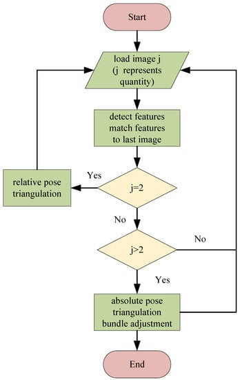 SfM systems are a method for computing the camera pose and structure from a set of images [80] and are mainly separated into two types, incremental SfM and global SfM. Incremental SfM [81,82] uses SIFT to match the first two input images. These correspondences are then employed to estimate the relative pose of the second relative to the first camera. Once the poses of the two cameras are obtained, a sparse set of 3D points is triangulated. Although the RANSAC framework is often employed to estimate the relative poses, the outliers need to be found and eliminated once the points have been triangulated. The dual-view scenario is then optimized by applying bundle adjustment [83]. After the refactoring is initialized, other views are added in turn, that is, matching the corresponding relationship between the last view in the refactoring and the new view.