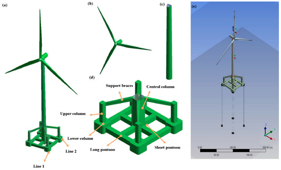 A model of the CENTEC-TLP with the DTU 10 MW. (a) A perspective view of the platform with the turbine in ANSYS APDL; (b) the blades of the wind turbine; (c) the tower; (d) the platform. (e) A perspective view of the platform with the turbine with mooring lines in ANSYS AQWA.