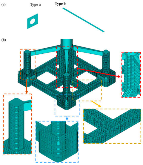 To model the TLP, Shell 281 element with eight nodes in the ANSYS is used (Figure 3). The ANSYS contact capability is utilized to model the interaction of the stiffeners and TLP. In contact between two elements, the node-to-line method is established as the target and the contact. The hull of the TLP was defined as the target surface, and the edges of the stiffeners were introduced as the contact surface. The mesh size is 0.5 m (Yeter et al. [14]) for the TLP and 1.0 m for the tower, and the turbine is 0.3 m.