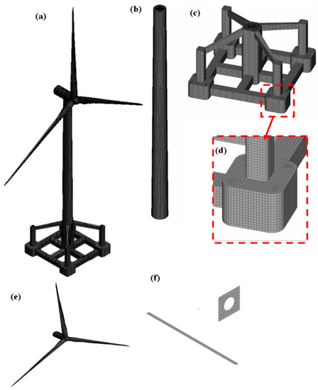 The meshed model of the CENTEC-TLP: (a) a perspective of the TLP with the tower and the 10 MW wind turbine; (b) the tower of the turbine; (c) the TLP; (d) the connection of the upper column with the lower column; (e) the meshed 10 MW turbine; (f) the meshed stiffeners.