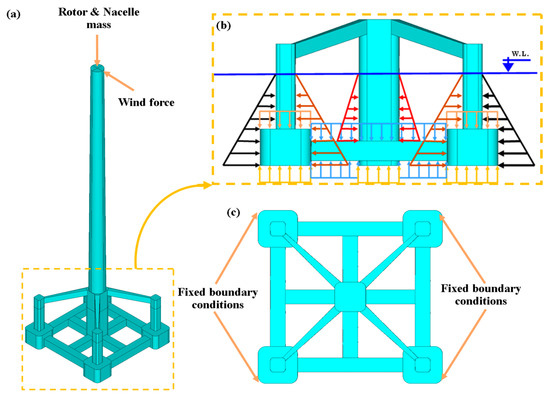 The mesh size is larger in the tower as the focus is on the stress distribution on the TLP. The meshed TLP with 10 MW wind turbine and stiffeners are presented in Figure 3. To analyze the stress distribution, the rotor, and the nacelle weight are defined as a point mass, and the wind pressure is defined as a force on the top of the tower (Figure 4a). The wind force and the moment of the nacelle and the rotor are 1500 kN and 40 MN·m, respectively. The TLP is under hydrostatic pressure as the still water, as shown in Figure 4b. The TLP’s draft after installation is 20 m. Fixed boundary conditions are used in each corner of the model in the locations of tendons (Figure 4c).