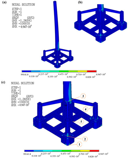 The stress distribution on the CENTEC-TLP with minimum stiffeners proposed by DNV-OS-C101 [35] and DNV-RP-C202 [41]; (a) the stress distribution on the TLP with tower, (b) the stress distribution on the TLP, (c) the TLP with marked maximum stresses in different points.