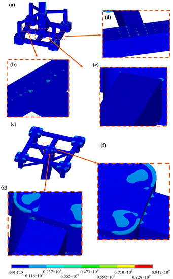 The stress distribution on the pontoons in the CENTEC-TLP; (a) a close view of the TLP, (b) the stress distribution on the pontoons on the opposite side of the TLP, (c) the stress distribution on the connection of pontoons with the central column, (d) the stress distribution on the downwind parts of the pontoon, (e) the stress distribution on the bottom of the TLP, (f) the stress distribution on the downwind parts of the pontoon in the bottom, (g) the stress distribution on the connection of the pontoon with the central column at the bottom.