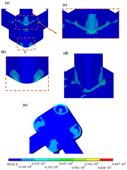 The stress distribution on the lower column and the mooring connections in the CENTEC-TLP; (a) a close view of the lower column, (b) the stress distribution on the mooring connections, (c) the stress distribution on the interaction of the lower column with the upper column (outside), (d) the stress distribution on the interaction of the lower column with the upper column (inner side), (e) the stress distribution on the bottom of the lower column.