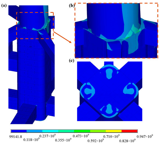 The stress distribution on the central column in the CENTEC-TLP; (a) a close view of the central column, (b) the stress distribution on the connection of the tower of the DTU 10 MW and central column, (c) the stress distribution on the bottom of the central column.