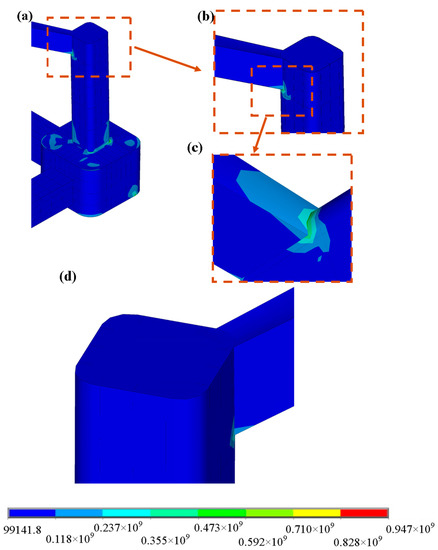 The stress distribution on the upper column and the support brace in the CENTEC-TLP; (a) a close view of the upper column, (b) the stress distribution on the connection of the support brace and upper column in the leeward, (c) the stress distribution on the bottom of support brace in the leeward, (d) the stress distribution on the bottom of support brace.