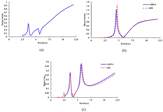 Response amplitude operator of the platform in its free-floating condition: (a) surge; (b) heave; (c) pitch.