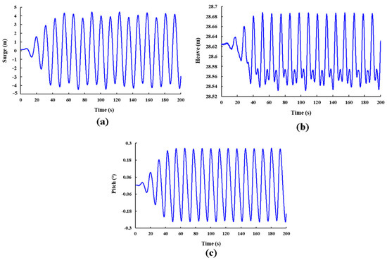 The time series of motions obtained in the regular wave: (a) surge (m); (b) heave (m); (c) pitch (degree).