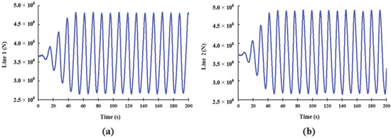 The mooring forces obtained in the regular wave. (a) Line 1; (b) Line 2.