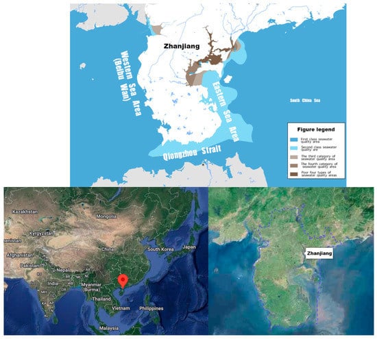 Zhanjiang is located on the Chinese mainland’s southernmost tip, in the southwest of Guangdong Province, bordering the South China Sea in the east and the Beibu Gulf in the west, and has a tropical northern monsoon climate (Figure 1). The city is typical of a coastal city []. By the end of 2021, the city’s resident population is projected to reach 7,030,900, marking an increase of 5,020,000 compared to the previous year’s end. Out of the total resident population of 3,266,600, 3,266,600 were urban residents, accounting for 46.46 percent of the total resident population, which represents a 10 percentage points increase compared to the previous year’s end. There were 8.41 million births annually, resulting in a birth rate of 12.00‰. The city also recorded 27,200 deaths, with a death rate of 3.88‰. The natural growth of the population was 56,900, with a natural growth rate of 8.12 percent. In 2021, Zhanjiang recorded a gross regional product (preliminary figures) of 355.993 billion yuan, representing an 85% year-on-year increase. Out of this figure, the primary industry added a value of 64.094 billion yuan, marking a 7.8% increase and contributing to 17.9% of the regional GDP growth. The secondary industry, on the other hand, contributed a value of 137.318 billion yuan, reflecting an 11.3% increase and contributing to 46.9% of the regional GDP growth. The tertiary industry added a value of 154.581 billion yuan, representing a 67% increase and contributing to 35.2% of the regional GDP growth. The proportion of the three industries stood at 180:386:43.4, with the secondary industry’s proportion increasing by 32 percentage points. The per capita GDP reached 50,814 yuan, showing an 81% increase (the data used in this paper are sourced from the Zhanjiang City National Economic and Social Development Statistical Bulletin).