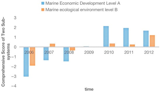 To generate the comprehensive score, we used a weighted scoring system that took into account various indicators related to the environment, economy and society. Sub-system 1 and Sub-system 2 refer to the two main components of the scoring system, with Sub-system 1 focusing on economic and social indicators, mainly the value of the integrated level of development of the marine economic system. Sub-system 2 focuses on environmental indicators, mainly the value of the integrated level of the development of the marine ecosystem. The data used here are from the China Marine Statistical Yearbook and China Marine Yearbook [].