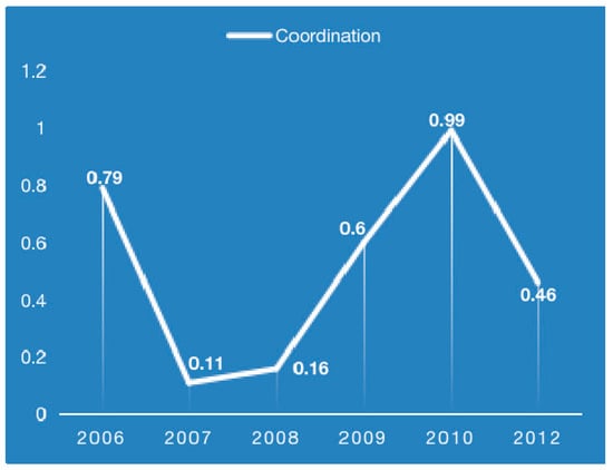 According to Figure 5, from 2006 to 2012, the coordination coefficient of the marine economic system to the ecosystem in Zhanjiang showed an overall increasing trend, and showed a huge increase in 2009 and 2010, while from 2006 to 2007 and from 2010 to 2012, the coefficient showed a more moderate change, indicating that the development of the marine economy in Zhanjiang is approaching the coordination value required by the marine. This indicates that the development of the marine economy in Zhanjiang is approaching the coordination value required by the marine ecosystem [].