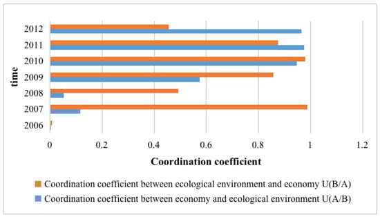 The marine economic and ecological compatibility coefficient is a measure used to assess the level of compatibility between economic activities and ecological conservation in the marine environment. This coefficient is derived by comparing the value of economic activities with the level of ecological impact they have on the marine environment. Based on the economic value and ecological impact of each activity, a score for economic and ecological compatibility can be assigned. This score indicates the level of compatibility between economic activities and ecological conservation in the marine environment []. When the U(A/B) coefficient increases, it represents a positive correlation and promotion of the impact of the ocean economy on the marine ecological environment, while the opposite represents a negative correlation and impact. When the U(B/A) coefficient increases, it represents a positive correlation and promotion of the impact of the development of the marine ecological environment on the ocean economy. Otherwise, it represents a negative correlation and impact due to the need for economic investment to alleviate the deterioration of the marine ecological environment caused by environmental changes. The larger the difference between the two indicators, the lower the compatibility degree. Otherwise, the compatibility degree is better.