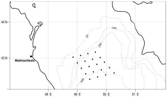 For the solution of the study tasks, phytoplankton samples were analyzed, which were collected at different seasons of the year during the research periods of 2004–2008 and 2019–2022 at 25 stations in the deep-water areas of the Middle Caspian Sea (Figure 1).