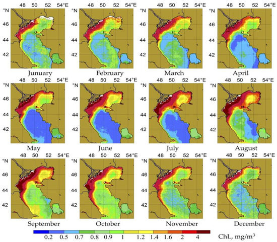 Monthly averaged distribution of chlorophyll “a” in the Caspian Sea during the summer–autumn period of phytoplankton growth.