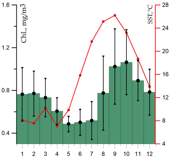 Average monthly values of chlorophyll “a” concentration (mg/m3 green columns), standard deviation (vertical black lines) and temperature in °C (red line) in the Middle Caspian (average values for the period from 1998 to 2021).