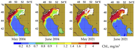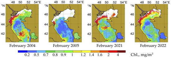 Chlorophyll “a” concentrations (mg/m3) in the surface layer of the Caspian Sea during the winter blooms of phytoplankton in 2004, 2021, and the immediately succeeding years.