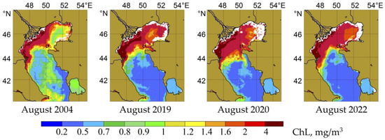 According to satellite data, the summer–autumn period of phytoplankton growth began in August. It was reflected in the chlorophyll’s distribution in the sea’s surface layer (Figure 6). The increase in CHL concentrations gradually spread from the western part of the Middle Caspian Sea to its open areas. The timing and intensity of the summer–autumn growth of phytoplankton differed from year to year (see Figure 3).