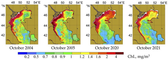 According to averaged satellite data, the autumn season was the most productive period for the Middle Caspian Sea. However, the intensity and timing of the autumn growth of phytoplankton varied from year to year. In general, October 2004 and 2005 were characterized by higher phytoplankton production rates than the period 2019–2021 (Figure 7).