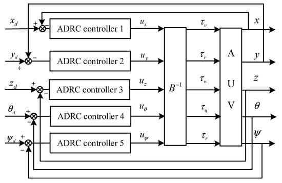 For the 5-DOF model of AUV in Equations (1) and (2), which is a strongly coupled MIMO system. In order to facilitate the design of the controller in the latter, it is necessary to decouple the control of the AUV model using the ADRC technique.