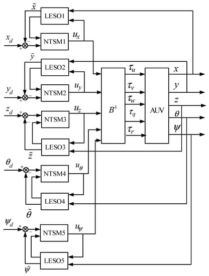 After the above discussion, the basic framework of the decoupling control of the AUV system based on ADRC technology has been initially developed. In this section, we will introduce the design process of the AUV 3D trajectory tracking controller based on the NTSM-ADRDC. The total control framework of the proposed algorithm is depicted in Figure 4. The control frame is divided into five channels: and , among which each channel is an independent SISO system. The LESO has strong ability to observe the total disturbance of AUV system, and the introduction of the exponential reaching law in NTSM allows for faster convergence of tracking errors. The close combination of the methods constitutes the NTSM-ADRDC controller.