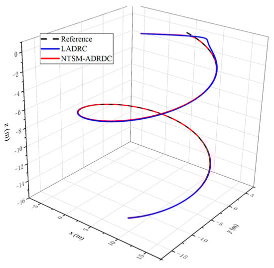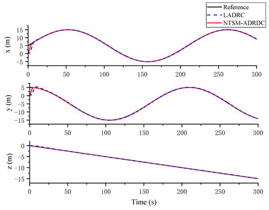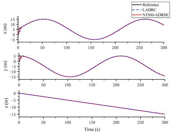 Figure 5 shows the three-dimensional trajectory curves of two different control algorithms without disturbance. The cylindrical spiral is used as the reference trajectory to simulate the tracking of the spiral diving target by the AUV. The black dotted line represents the reference trajectory. The blue solid line represents the AUV tracking result under the LADRC algorithm. The red solid line represents the simulation result of the designed NTSM-ADRDC. It can be seen from the figure that the three-dimensional trajectory curves of the two control algorithms without disturbance are consistent with the reference trajectory. It shows that although the initial position of the AUV is far from the reference trajectory, both methods can track the reference trajectory more accurately and quickly. However, there is an overshoot in NTSM-ADRDC compared to LADRC. The position tracking performance of the AUV is shown in Figure 6. We can observe that both control algorithms show good trajectory tracking performance.