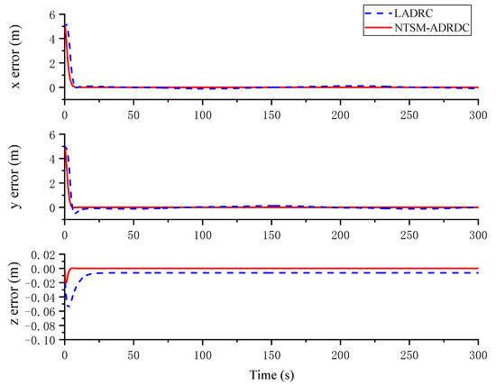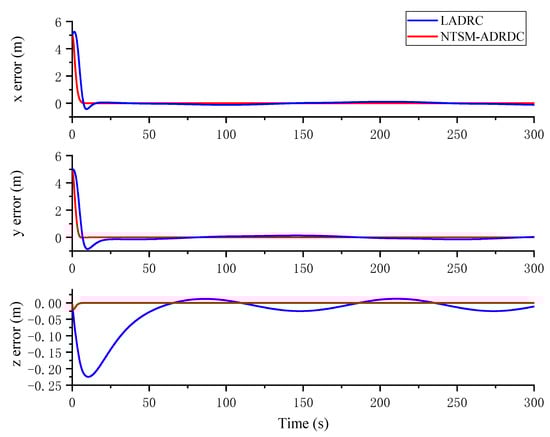 The position tracking performance of the AUV is shown in Figure 6. We can observe that the two control algorithms can follow the corresponding reference trajectory curve well. Through the comparison of the first 20 s, it can be clearly found that the NTSM-ADRDC algorithm can approach the desired position faster. By comparing the position error of the two control methods in Figure 7, can we discover NTSM-ADRDC has a faster error convergence rate than LADRC.