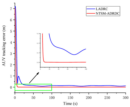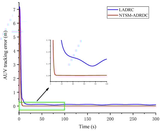Figure 8 shows the comparison curve of AUV trajectory tracking error. Since the initial position of the AUV is far from the starting point of the reference position, it takes a certain time for the AUV to make the trajectory tracking error tend to 0. The AUV tracking error tends to zero after approximately 8 s under the ATSM-ADRDC algorithm, while LADRC is about 20 s. This shows that the error convergence time of the former is shorter than that of the latter. From the partial enlargement, we can clearly see that the trajectory tracking error of ATSM-ADRDC converges more smoothly compared to LADRC.