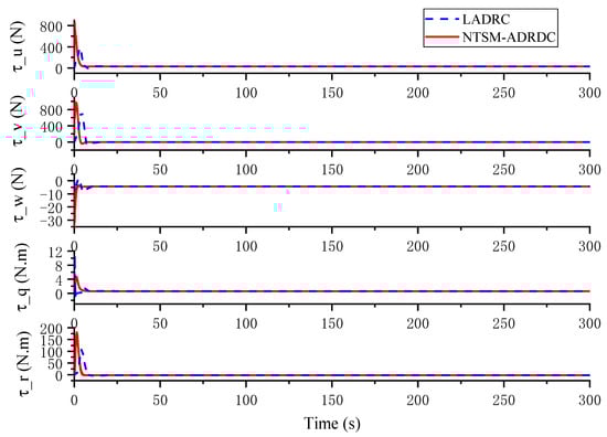 To further evaluate the tracking error accuracy of the AUV under the two controllers, we introduce three indicators related to the tracking error: the maximum tracking error (Max), the minimum tracking error (Min), and the average tracking error (Avg). The tracking error measurement values after 20 s are shown in Table 2. Taken together, it can be concluded that the control accuracy of NTSM-ADRDC is much higher than that of LADRC. As can be seen from Figure 9, the proposed NTSM-ADRC scheme has almost no “chattering” in the control inputs. It also indicates that the use of the tanh function to replace the sign function can reduce “chattering”.