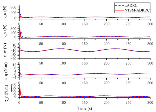 The tracking error measurement values after 26 s are shown in Table 3. In the presence of disturbance, the average of the tracking error of NTSM-ADRDC is 0.00162 m, while LADRC is about 0.12461 m. This indicates that the designed controller has high control accuracy in the presence of ocean currents and external disturbances. Figure 14 shows the control input of AUV with disturbance. We can see that there is some fluctuation in the control input due to the presence of ocean currents and external disturbances.