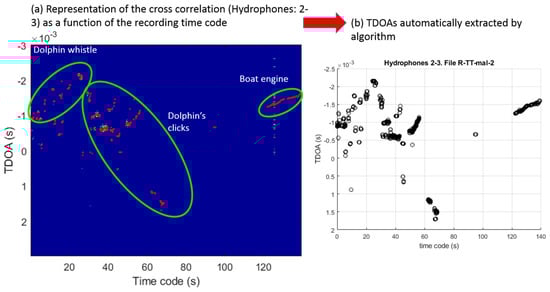 For each detected acoustic event, the estimated time differences of arrival (TDOAs) were calculated from the cross-correlation applied on the 6 pairs of hydrophones. As presented in Figure 2, such a transformation highlighted the estimated TDOAs produced by all the sound sources. The time frame could be adjusted from 10 ms to 1 s. Short time sliding windows were adapted to impulsive/transient sounds; longer durations were adapted to continuous tonal sounds.