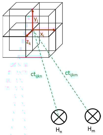 Geometric definition of the propagation distance between a given cubic mesh and a given pair of hydrophones n m.